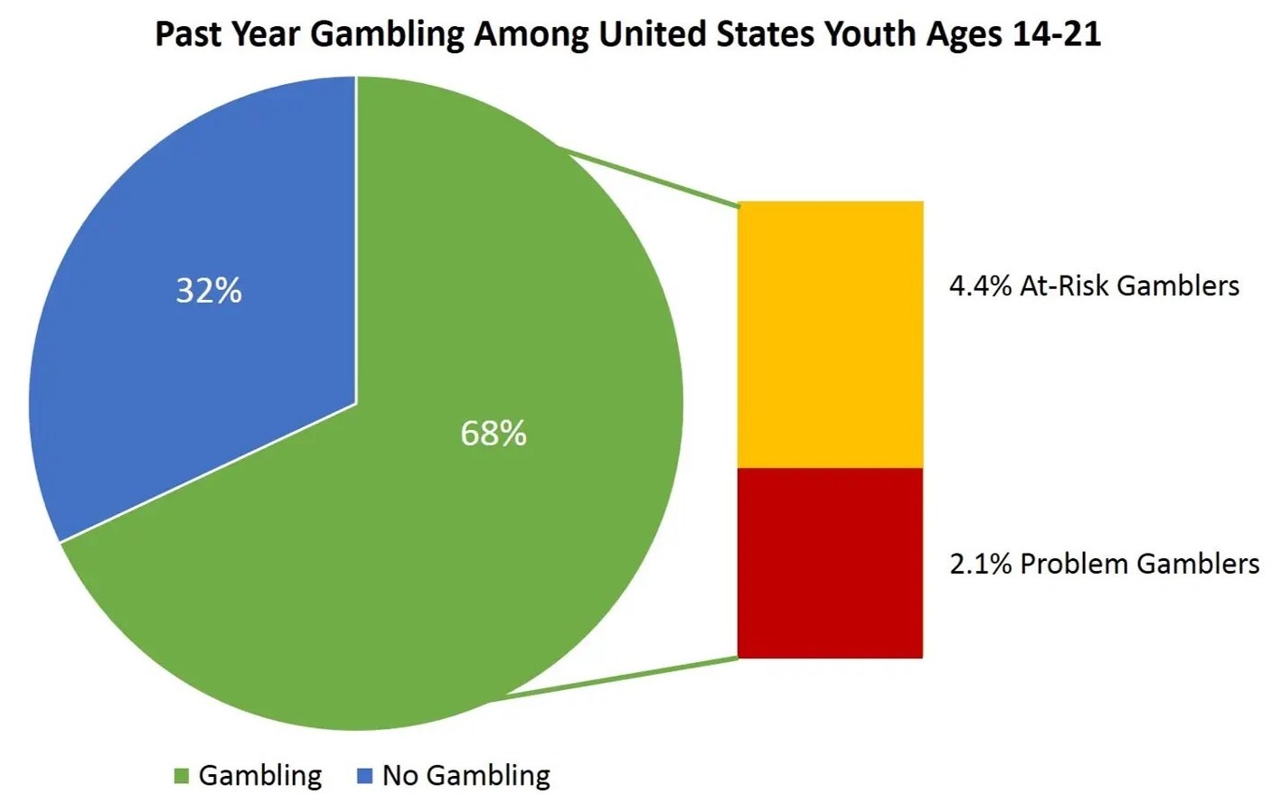 According to the National Council on Problem Gambling, approximately 2-3% of the adult population in the United States struggles with problem gambling. This equates to nearly 6-9 million Americans grappling with their gambling habits’ potential consequences. However, due to Welte, last year in the USA, around 68% of youth aged 14-21 gambled at least once a year, and only 2.1% developed problematic addiction. 4,4% of young players are considered ‘At-Risk.’